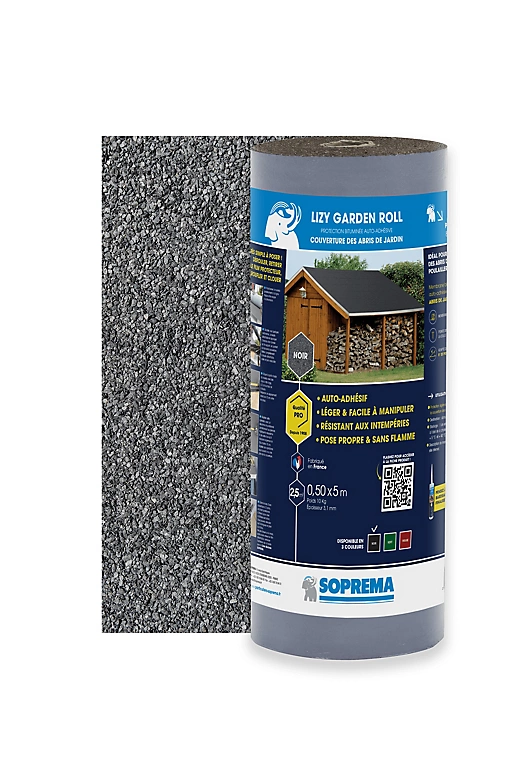 LIZY GARDEN ROLL SOPREMA® est une feuille bitumineuse auto-adhésive, constituée de bitume élastomère et d’une armature composite, utilisée dans l’étanchéité des toits de vos abris de jardins, auvents, abris de voitures, dès 5° de pente. La face supérieure est protégée par des paillettes d’ardoises. La face inférieure est recouverte de bitume autocollant protégé par un film détachable. LIZY GARDEN ROLL SOPREMA® s’utilise exclusivement en extérieur.
